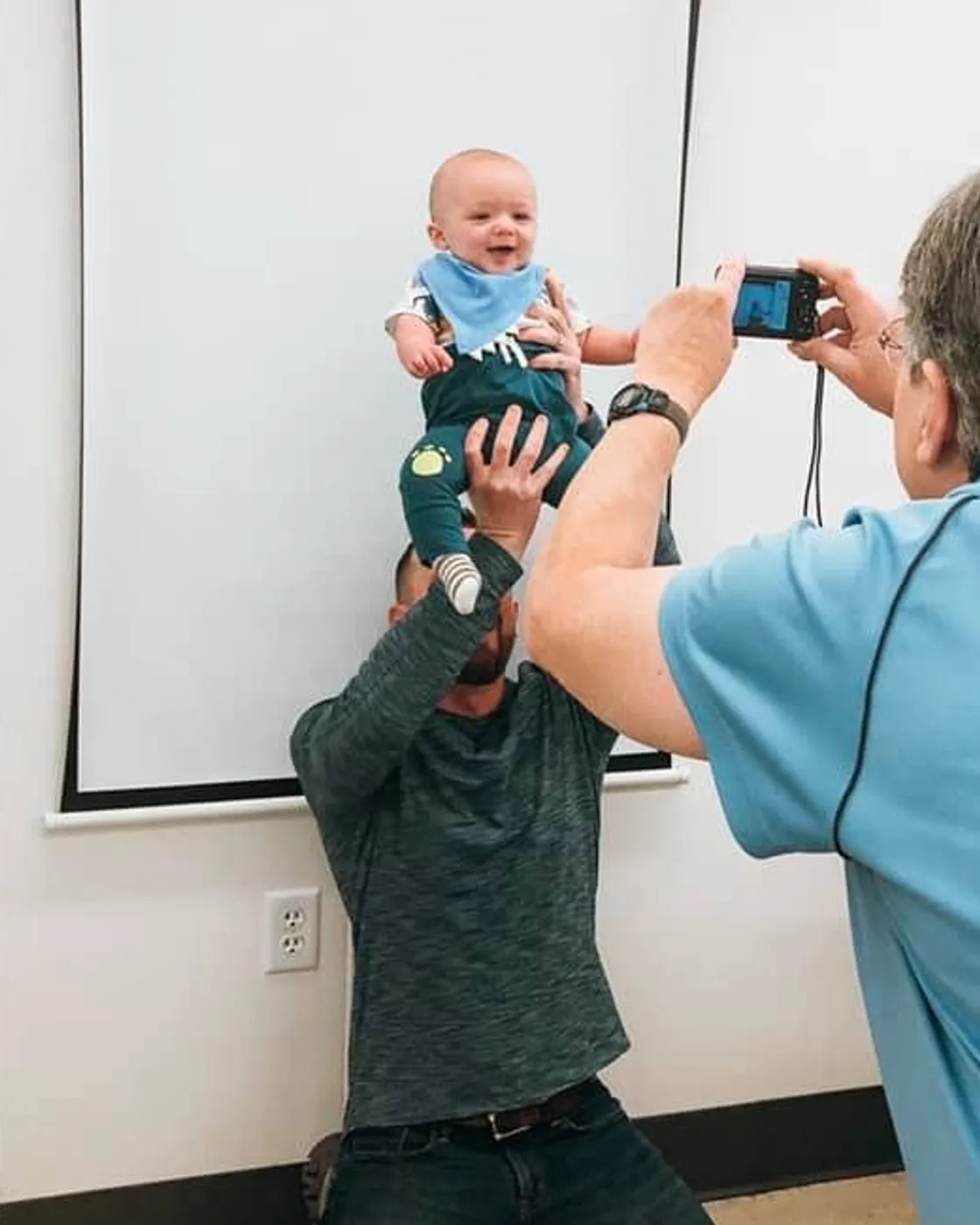 Yes — infant and baby passport photos are one of our regular services. The US State Department requires baby passport photos to meet the same 2x2 inch specs as adult photos: white background, eyes open, face clearly visible, no shadows. We lay the baby on a white sheet or blanket and photograph from directly above. We'll help you get the right shot — most babies take 5–10 minutes. Dress them in solid-colored clothing (avoid white).